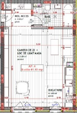 Compartimentarea este semidecomandata, suprafata utila este de 41.10 mp. si se prezinta astfel: hol, baie, bucatarie open space cu living.