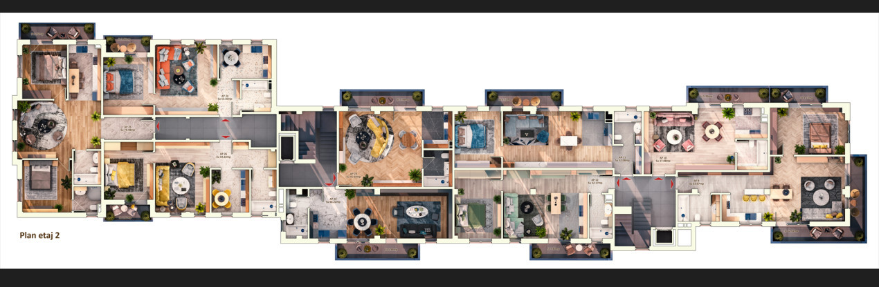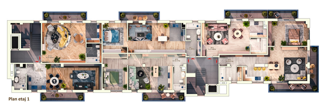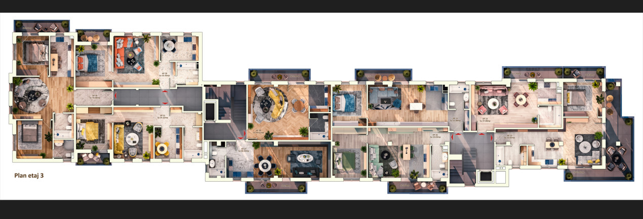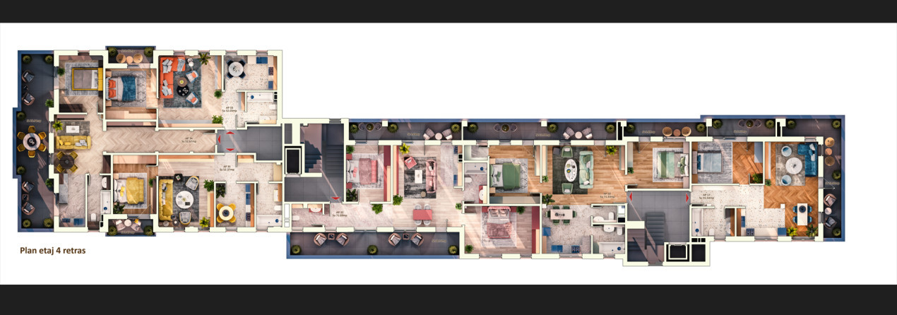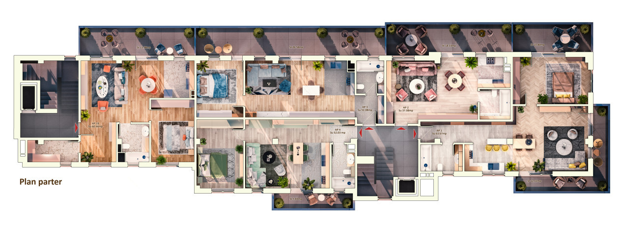 Apartamente disponibile cu 1, 2 si 3 camere, suprafete intre 37 mp si 71,5 mp cu terase intre 37-71,5 mp. Spatiile verzi au un concept peisagistic deosebit. Locuri de parcare subterane si platforma subterana pentru colectarea deseurilor.