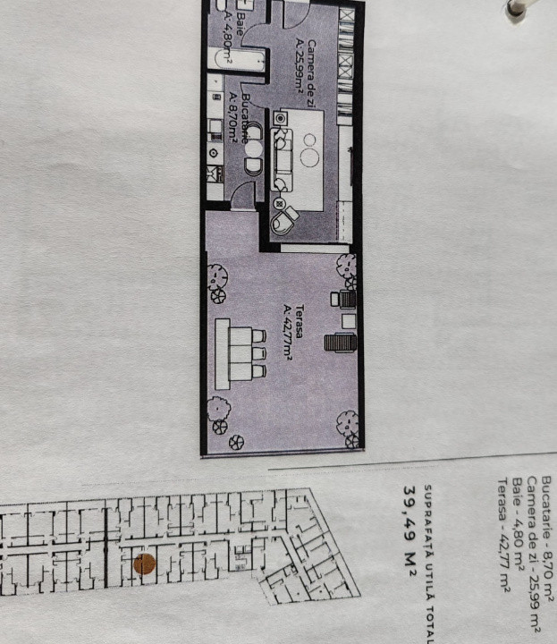Suprafața utilă este de 39,49 mp la care se adaugă o terasă de 42,77mp cu acces din dormitor si zona de living.