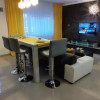 Living open-space cu bucătărie, 2 dormitoare, 1 baie, debara, 3 balcoane, garaj închis aflat la parterul blocului.