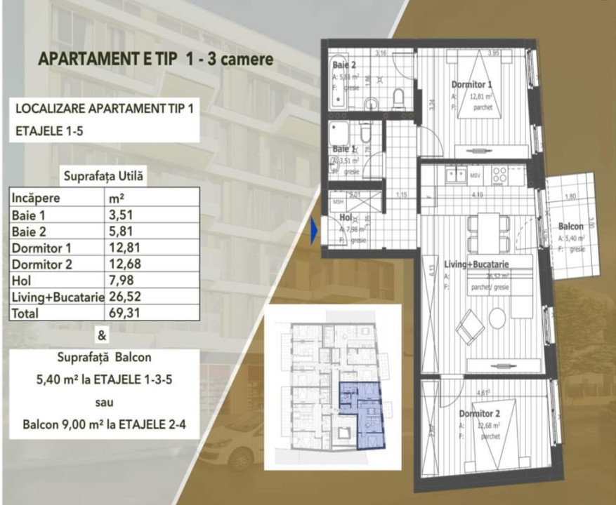 Apartamentele sunt situate intr-un imobil cu regim de inaltime D+P+5+Er. Localizarea imobilului este una semicentrala, la doar 3 minute de piata Mihai Viteazu si 5 minute de centrul orasului.