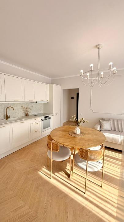 Apartamentul este nou și dispune de centrală termică proprie, plită cu inducție, hotă cu putere mare de extracție, cuptor electric cu autocurățare, combină frigorifică încorporată și tâmplărie PVC cu 3 sticle (profil 7 camere), oferind confort termic și eficiență energetică.