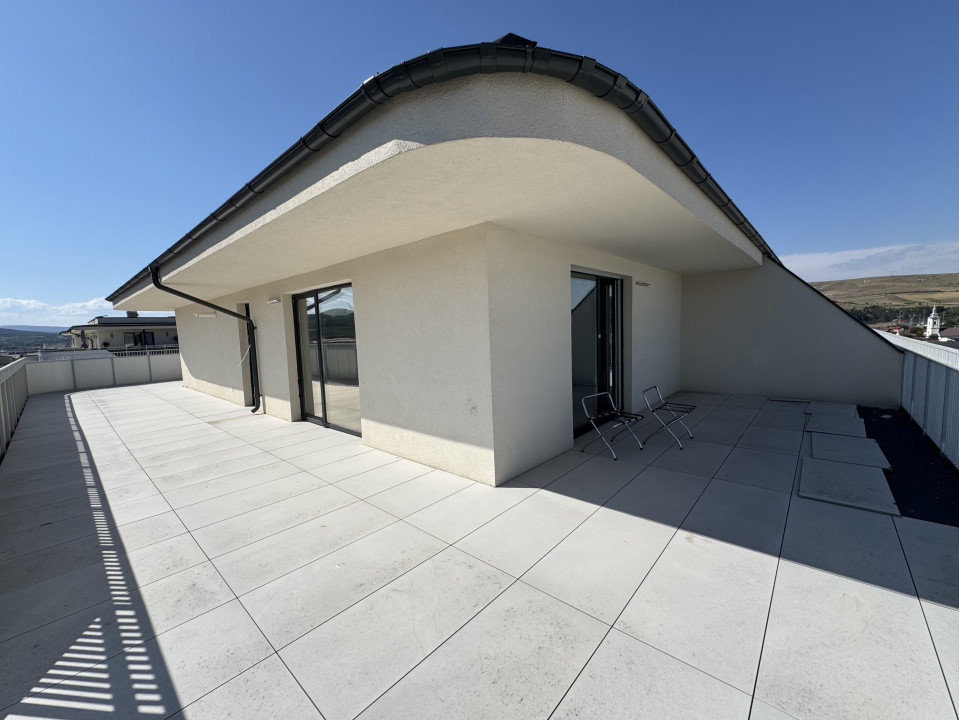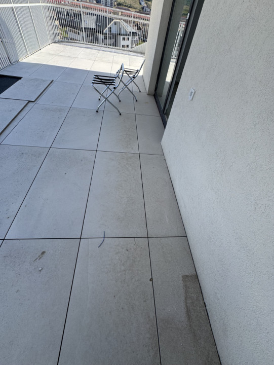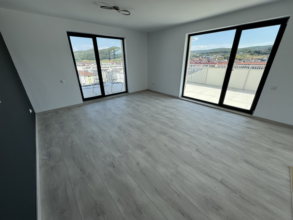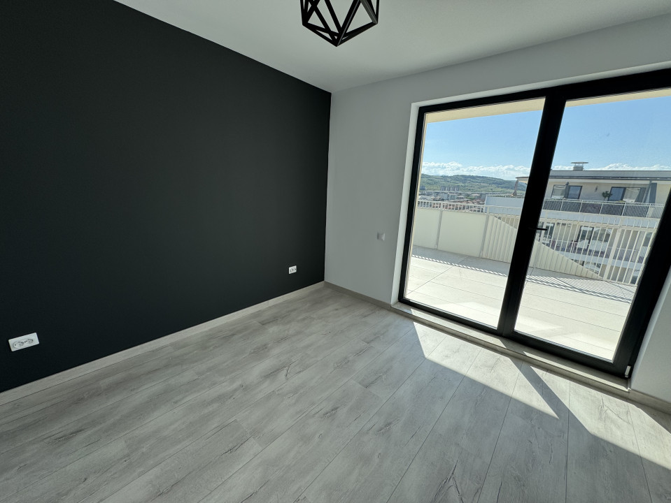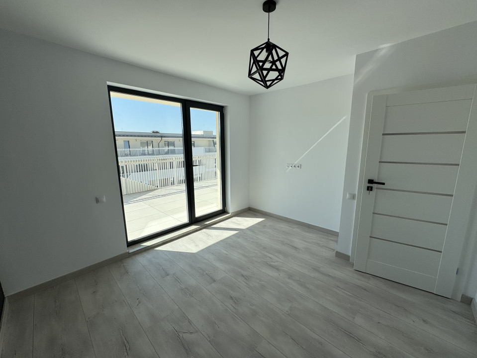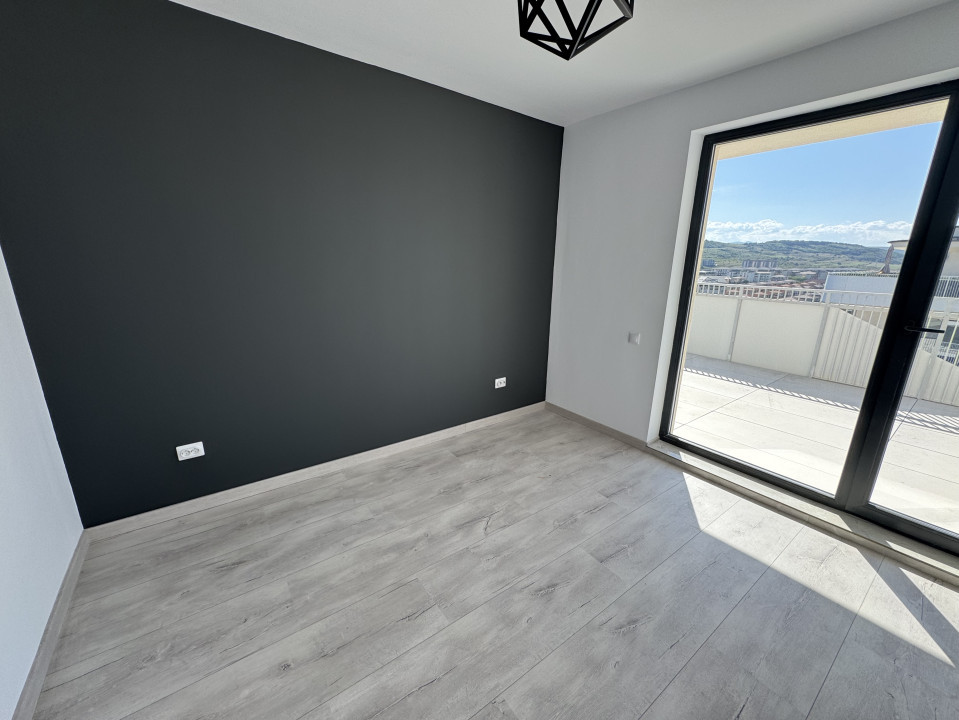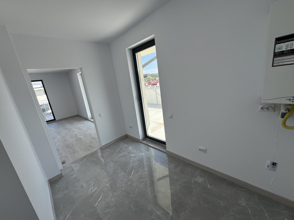 Compartimentarea este decomandata, suprafata utila este de 74 mp. si se prezinta astfel: hol, baie, bucatarie, living, doua dormitoare dintre care unul cu baie proprie si terasa de 110 mp.
