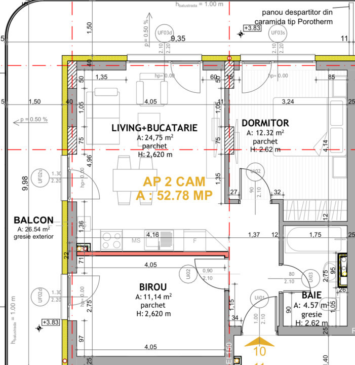 Va propunem spre vanzare un apartament de 3 camere aflat intr-un ansamblu rezidential din zona Centrala. Apartamentul este situat la etajul 1 al unui imobil structurat pe 6 niveluri avand o suprafata de 52.78 mp. Acesta este compartimentat astfel:1 dormitor, 1 hol, 1 baie, 1 living cu bucatarie, 1 birou si 1 terasa de 26.54. De asemenea, exista posibilitatea achizitionarii unui loc de parcare subteran la pretul de 6000 euro cu TVA inclus. La pret se adauga pretul balcoanelor de 400 euro/mp, TVA inclus. Pretul apartamentului este de 1650 euro/mp cu TVA inclus si se vor preda la stadiul de finisat. Pentru a programa o vizionare, nu ezitati sa ne contactati! ID extern P6818