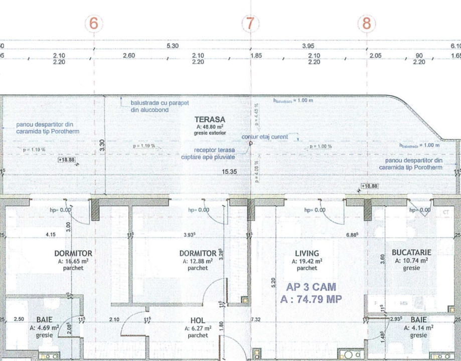 Va propunem spre vanzare un apartament de 3 camere aflat intr-un ansamblu rezidential din zona Centrala. Apartamentul este situat la etajul retras al unui imobil structurat pe 6 niveluri avand o suprafata de 74.79mp. Acesta este compartimentat astfel:2 dormitoare, 1 hol, 2 baie, 1 living, bucatarie si 1 terasa de 48.8mp. De asemenea, exista posibilitatea achizitionarii unui loc de parcare subteran la pretul de 6000€ cu TVA inclus. Balcoanele se platesc cu 310 euro/mp cu TVA inclus. Pretul apartamentului este de 1600 euro/mp cu TVA inclus la stadiul de finisat. Pentru a programa o vizionare, nu ezitati sa ne contactati! ID extern P6823