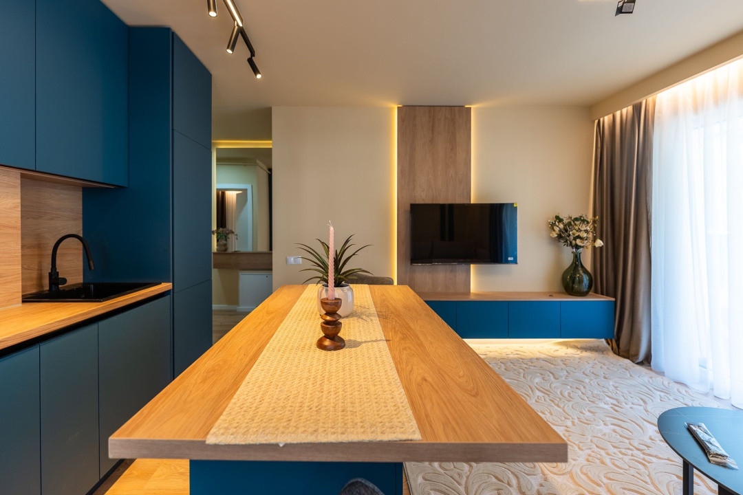 Apartamentul este finisat la cele mai inalte standarde, mobila este realizata la comanda si electrocasnicele sunt toate noi si in garantie.