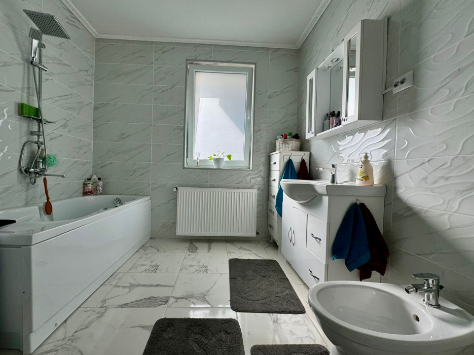 Casa, cu o suprafață generoasă de 200 mp utili este dispusă pe parter și mansardă (120 mp parter + 80 mp mansarda neamenajată) și include un living generos, 2 dormitoare luminoase și spațioase, 2 băi (1 baie mare, prevăzută cu cadă și geam, 1 baie exterioară, prevăzută cu duș, vas de toaletă și chiuvetă), 1 bucătărie complet mobilată și utilată, 1 hol central prevăzut cu o zonă de relaxare, 1 cămară și diverse dependințe, asigurând un spațiu optim pentru o viață de familie liniștită.