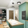 🔹 Parter: living cu bucătărie open-space (coș de fum pentru șemineu), cămară, birou, cameră tehnică, baie și terasă din lemn cu barbeque integrat.
