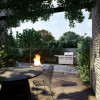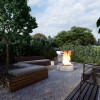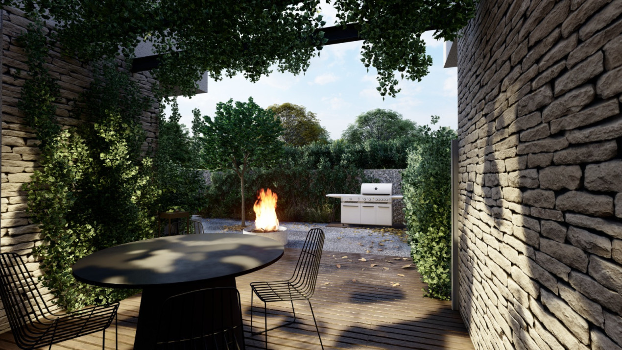 Curtea din spatele casei este impartita in 2 zone, o zona de relaxare, cu zona de gratar si vatra de foc precum si loc de luat masa, retrasa, perfecta pentru zilele toride de vara sau pentru seri linistite iar o parte importanta din gradina este mereu insorita si prevazuta cu plante si gazon.