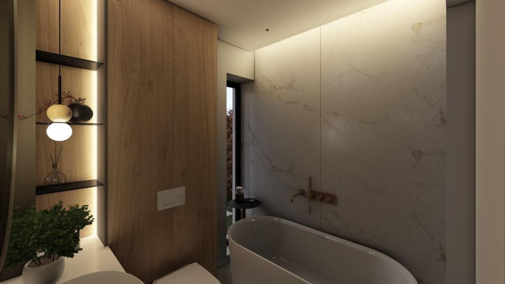 La interior avem incalzire in pardoseala si este de la Uponor, cu grup separat de pompare pe fiecare etaj. Centrala si pufferul sunt de la Ferolli si sunt varf de gama. Baile vin semifinisate cu cadrele de wc incastrate, iar instalatia sanitara in toata casa este realizata tot pe sistem de la Uponor(cu separare pe fiecare nivel)