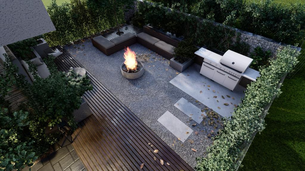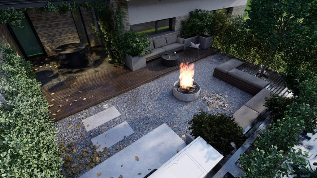Curtea din spatele casei este impartita in 2 zone, o zona de relaxare, cu zona de gratar si vatra de foc precum si loc de luat masa, retrasa, perfecta pentru zilele toride de vara sau pentru seri linistite, iar o parte importanta din gradina este mereu insorita si prevazuta cu plante si gazon.
