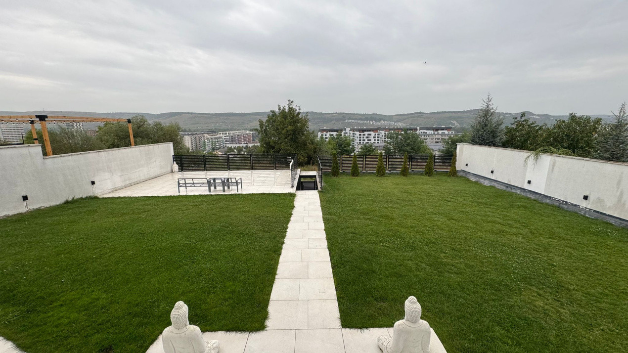 Curte de 500 m patrati cu doua terase mari acoperite cu ceramica si garaj de 60 m patrati din beton .