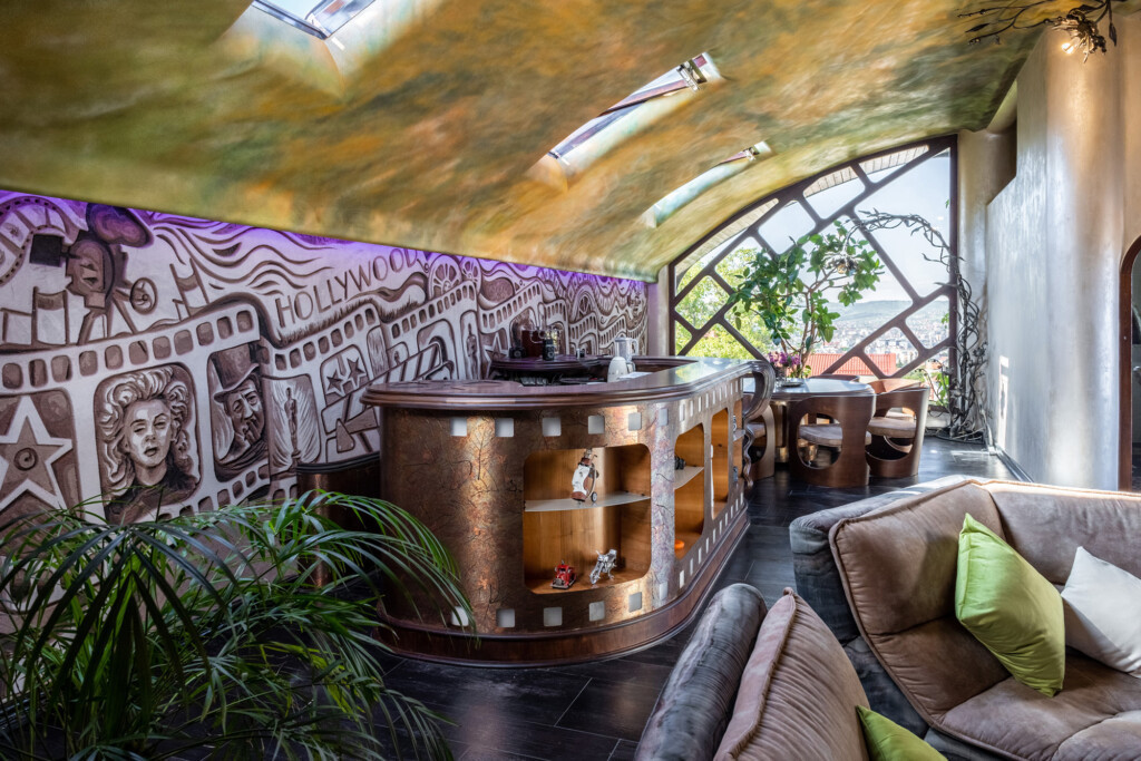 Mansarda este un open space compus din 3 zone distincte, din punct de vedere al utilității. Ele sunt delimitate de un stâlp central. La baza lui e un tablou rotund din mozaic, placat cu aur de 24 karate, lucrat manual, care susține tavanul pictat.