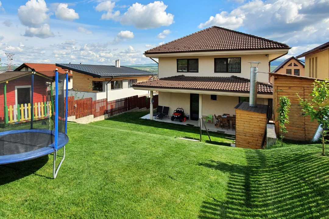 Toata casa are incalzire prin pardoseala, sistemul de incalzire / racire este asigurat de o pompa de caldura din gama premium, cu un randament foarte bun, de asemenea, tot pentru o eficienta energetica ridicata este montat si un sistem de panouri solare. Zona exterioara a casei este amenajata cu mult spatiu verde, zona de barbecue, spatii de joaca pentru copii, spatii de depozitare, sistem de irigatii complet automatizat, sistem de supraveghere video, sistem de alarma monitorizat de firma de protectie si paza.