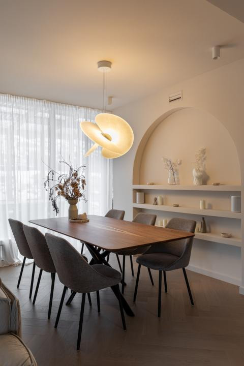 Parter: Living spectaculos cu semineu Brunner, ce se deschide catre o terasa acoperita și mobilata, doua bucatarii utilate complet cu electrocasnice Miele/Siemens (o bucatarie open-space cu livingul și una tehnica, inchisa). Pentru extra confort in exterior dispunem de o baie dedicata zonei verde si terasei.