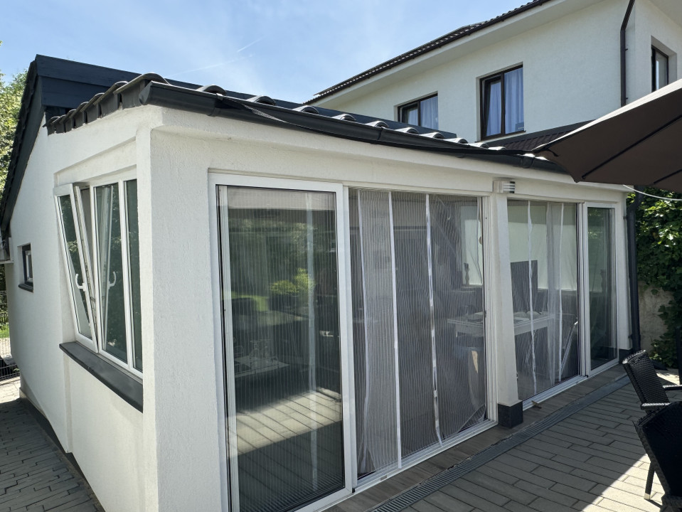 Va oferim spre vanzare o casa individuala in suprafata utilă: 225mp, plus o anexa in curte care poate fi folosita ca o casa pentru oaspeti in suprafata de 52mp, 6 locuri de parcare si debara. Teren liber amenajat cu gazon, în suprafață de 400mp, piscina exterioara.