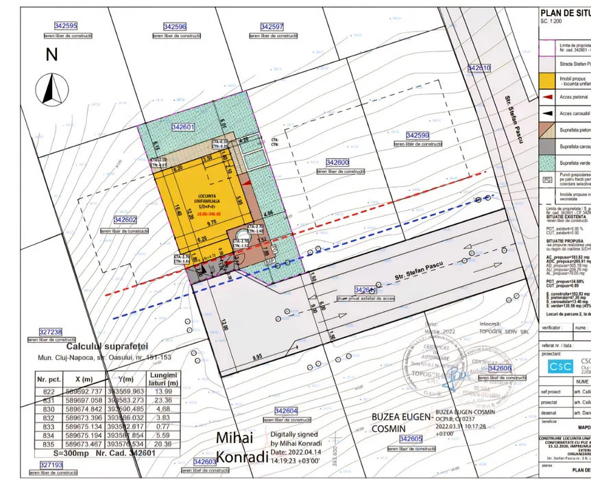 Etaj (78,61mp utili): dormitor matrimonial cu baie proprie, hol, doua dormitoare, baie, terasa acoperita, balcon acoperit.