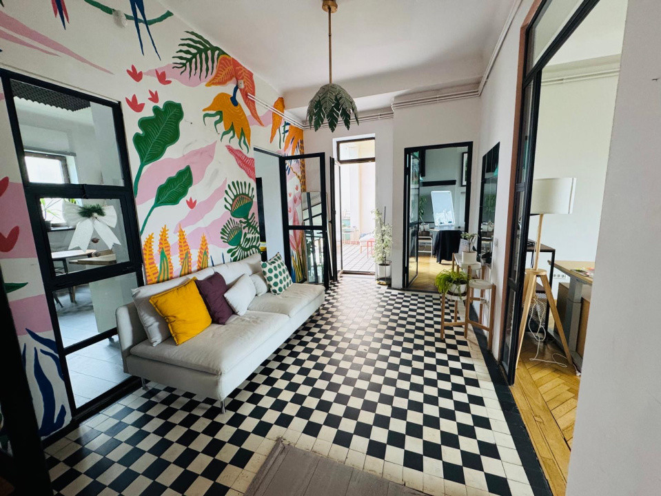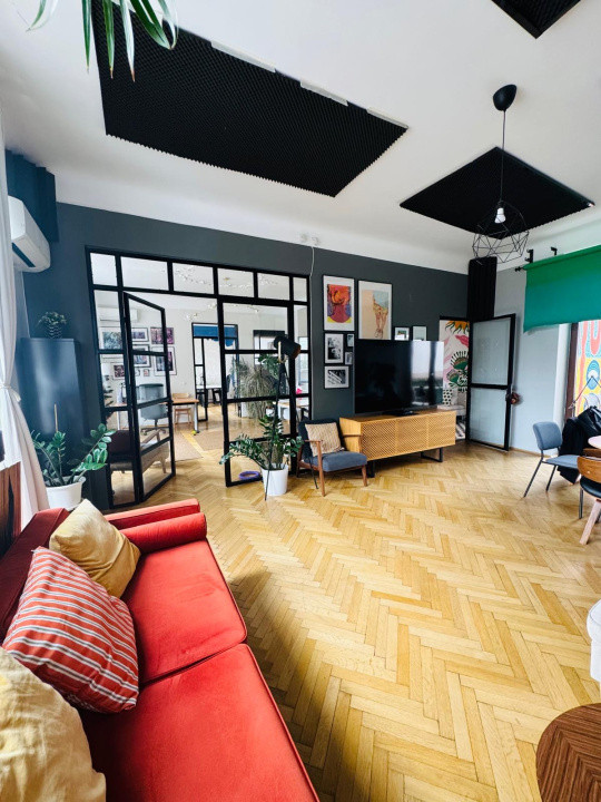 Spatiul dispune de o suprafata utila de 150 mp, compartimentat in 4 incaperi cu intrare separata fiecare, hol generos care poate fi utilizat ca si zona de asteptare sau receptie, baie, o terasa spatioasa, doua balcoane si acces la gradina din spatele cladirii.