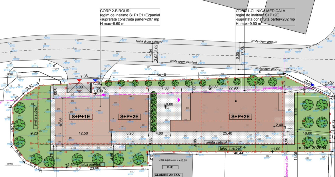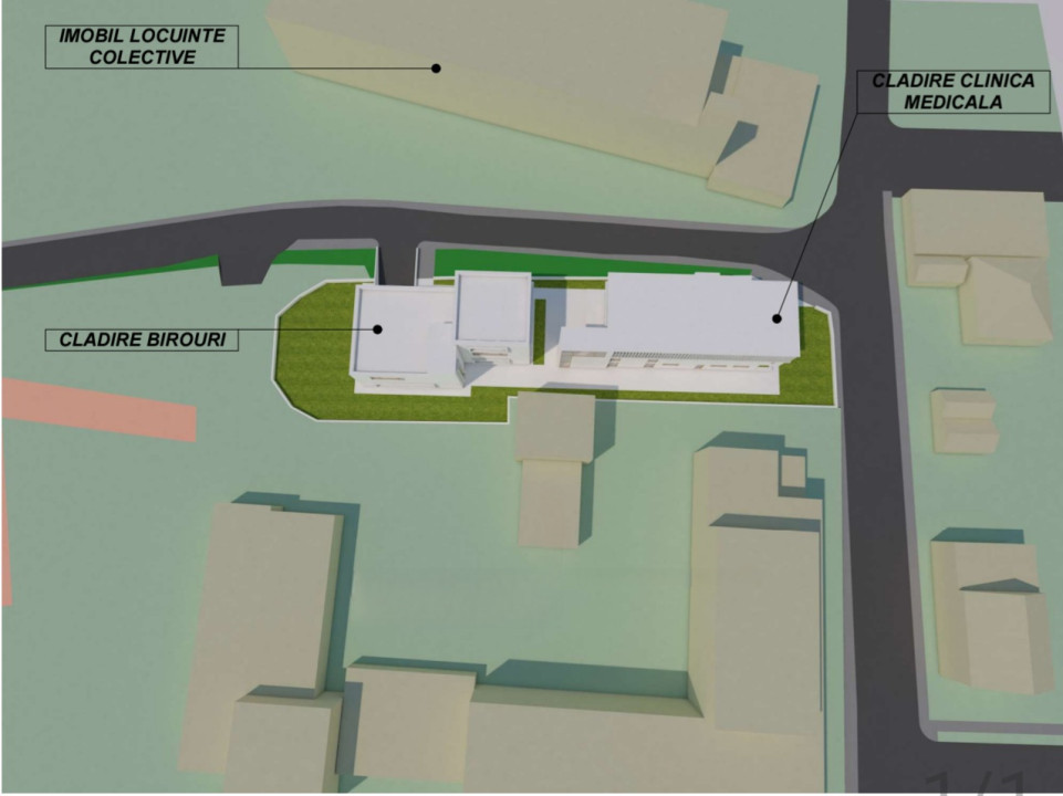 -Parter: 199.5 mp construiti- 169,32 mp utili pentru cladirea de birouri si 199 mp Construiti- 165,52 mp Utili pentru clinica.